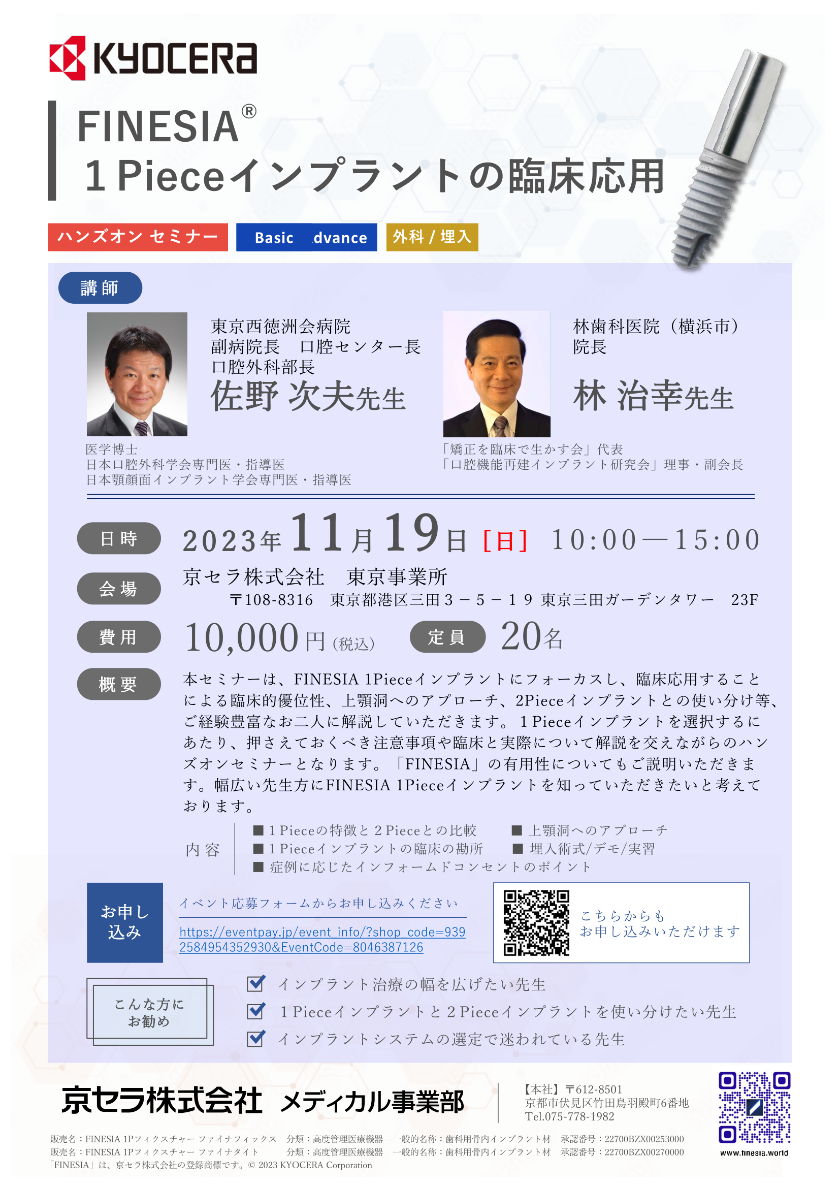 本セミナーは、FINESIA 1Pieceインプラントにフォーカスし、臨床応用することによる臨床的優位性、上顎洞へのアプローチ、2Pieceインプラントとの使い分け等、ご経験豊富なお二人に解説していただきます。1Pieceインプラントを選択するにあたり、押さえておくべき注意事項や臨床と実際について解説を交えながらのハンズオンセミナーとなります。「FINESIA」の有用性についてもご説明いただきます。幅広い先生方にFINESIA 1Pieceインプラントを知っていただきたいと考えております。